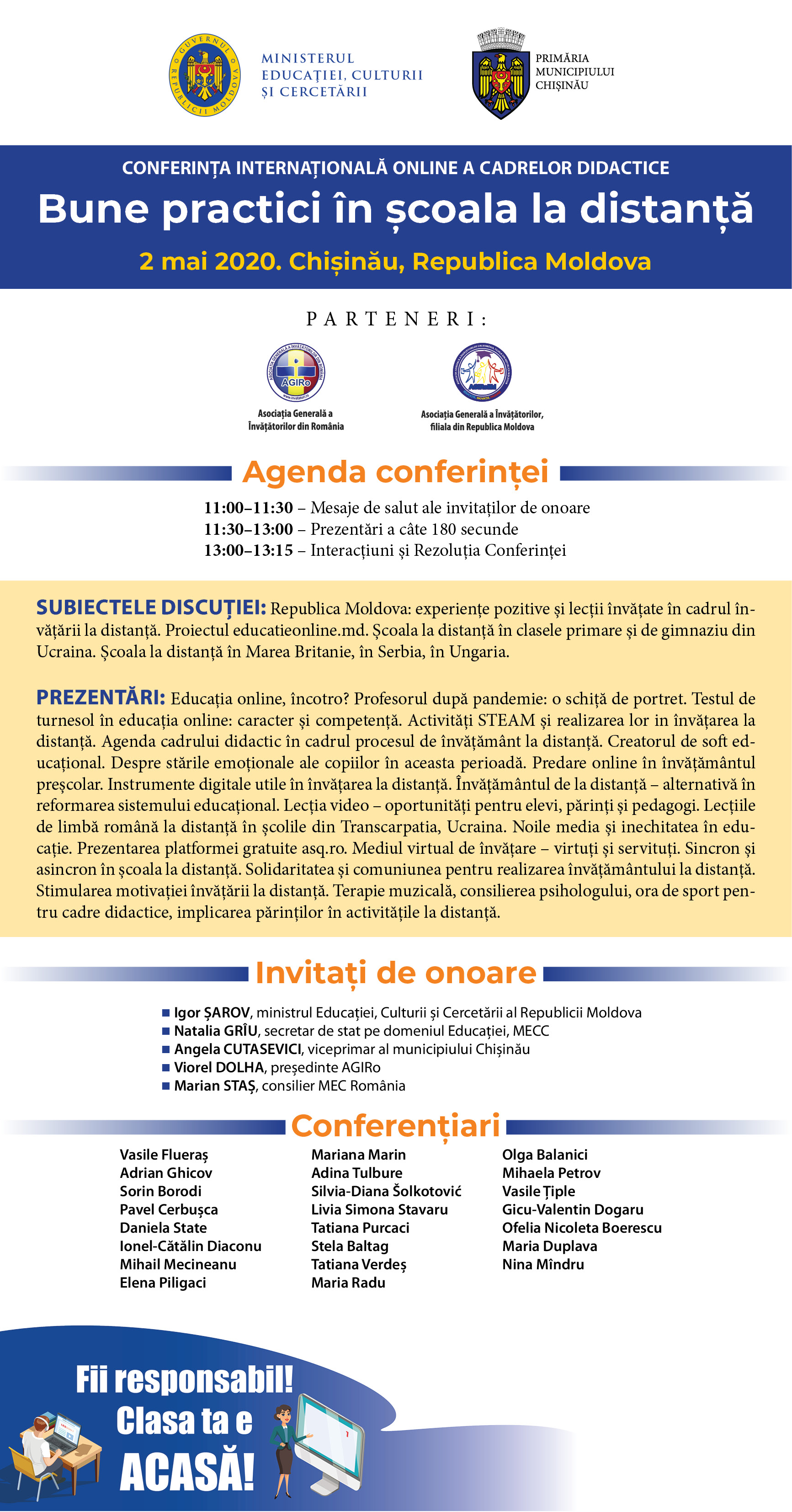 Cei 208 de participanți la Conferința internațională online a cadrelor didactice „Bune practici în școala la distanță”, originari din Republica Moldova, România, Ucraina, Serbia, Ungaria, Marea Britanie și Spania, exprimă înaltă gratitudine și recunoștință organizatorilor evenimentului.